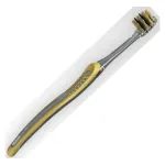Escova de dente com cabo transparente e emborrachado dourado, com cerdas grossas pretas e douradas