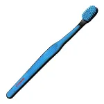 Escova de dentes fina e longa com corpo preto e azul e cerdas pretas e finas