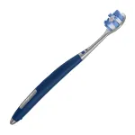 Escova de dente com cabo cinza e borracha azul, com cerdas grandes e grossas azuis e brancas