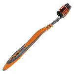 Escova de dentes com cabo preto, borracha laranja e cerdas grandes e grossas pretas e laranjas